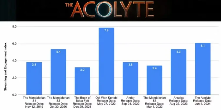Reelgood’s insights show that despite a rocky start with lower initial viewership compared to Ahsoka, The Acolyte has managed to captivate audiences, achieving six times the engagement of the average top 100 TV shows. In contrast, Obi-Wan Kenobi leads with an engagement factor of eight.